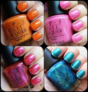 Malé rekápko kolekce OPI Summer Flutter, loňské mini letní kolekce. A jakže se to povedlo? To je otázka vkusu, pro mě osobně jsou dva laky nezajímavé, dva se mi docela líbí (jeden z nich docela dost). Vzhledem k tomu se i odlišně lakují, zatímco na šupinkové jsou třeba tři vrstvy, na zbytek starší dvě.